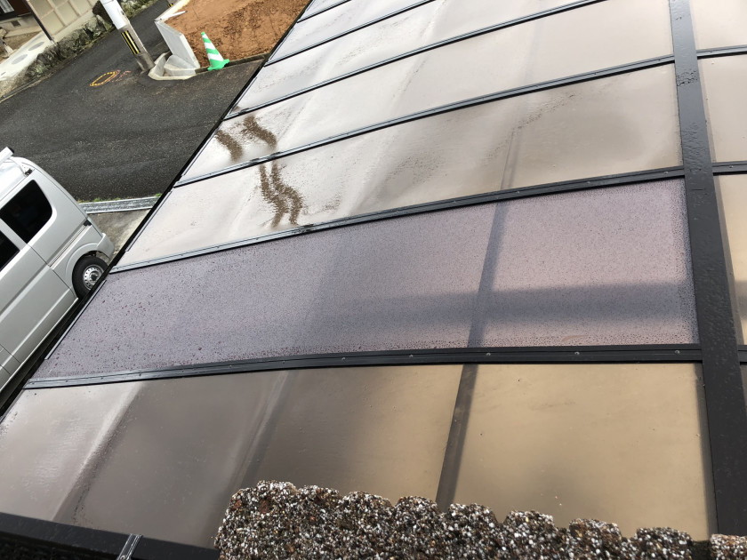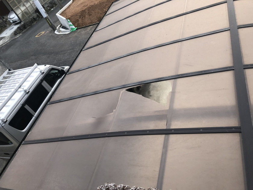 屋根から落下した雪で、穴が空いたカーポートもこの通り!
